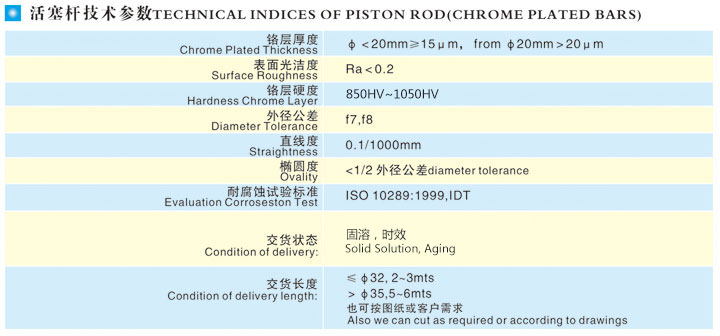 本產品表面經特殊研磨及硬鉻電鍍技術外理,再經鏡面拋光而成,具有耐磨擦、抗腐蝕性特性,可用作各種氣缸、油缸、包裝機械、木工機械、紡織機械、印染機械、壓鑄機、注塑機及其它機械的導桿、頂桿。